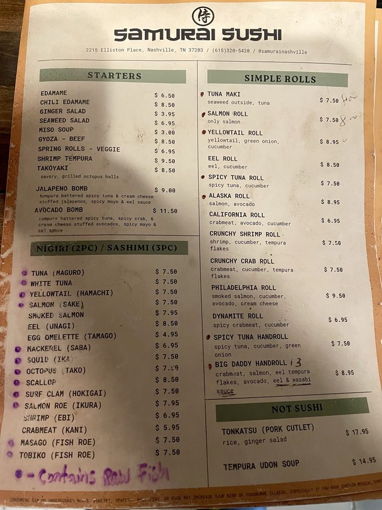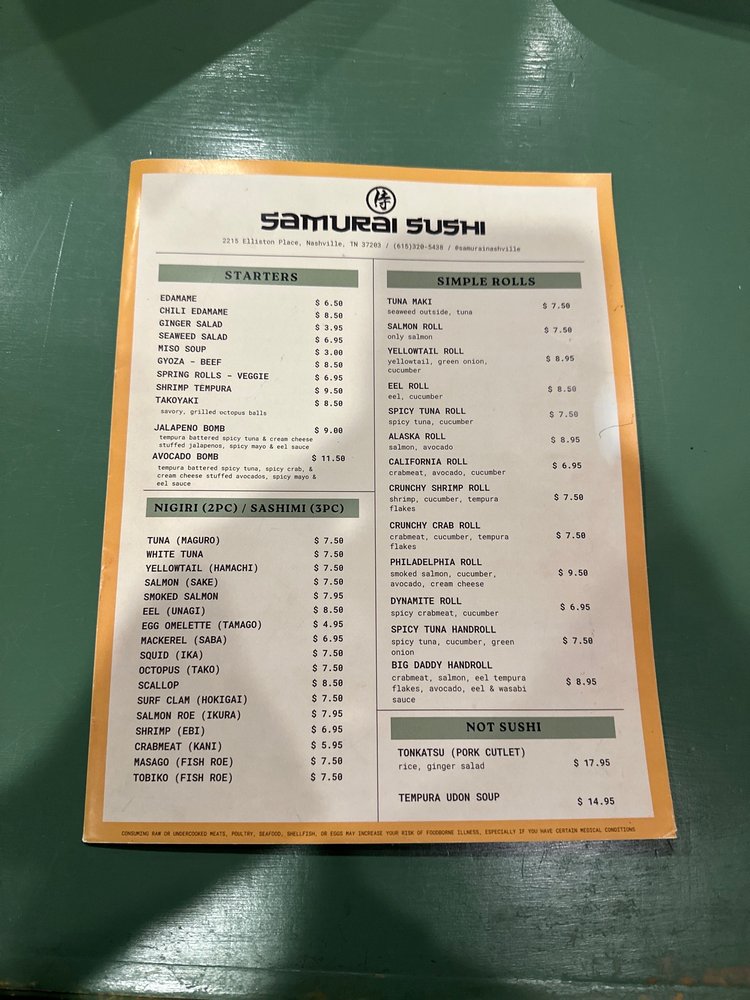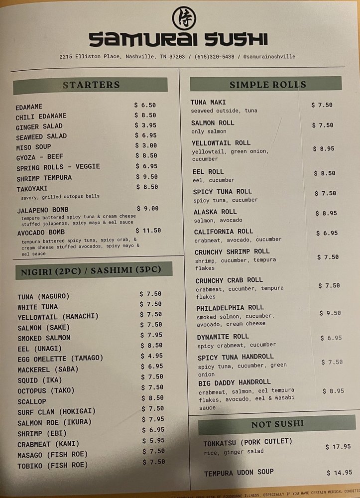 Welcome to Samurai Sushi Nashville, a culinary gem nestled in the heart of Nashville at 2215 Elliston Pl. This Japanese restaurant harmoniously blends traditional sushi craftsmanship with vibrant flavors. Their menu is a delightful journey, showcasing both hot dishes and exquisite rolls.